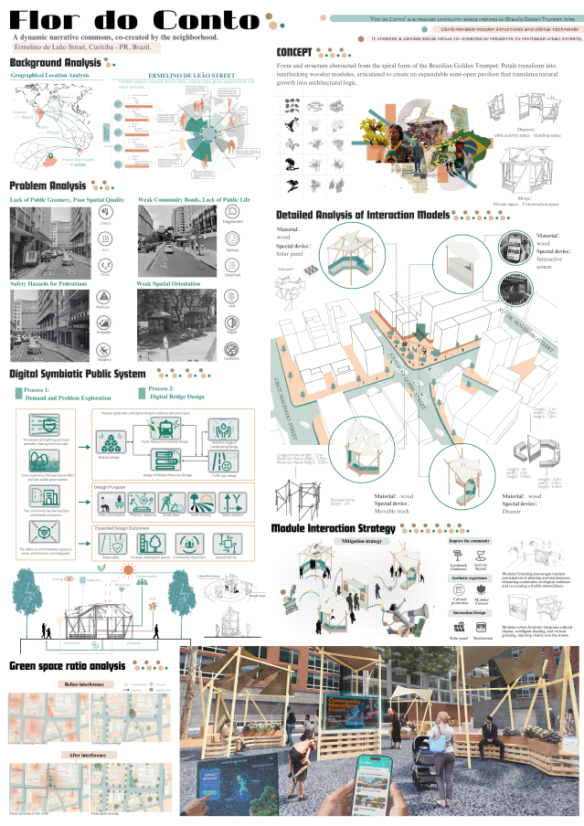 团队获奖作品《Flor do Conto》直面巴西库里蒂巴典型街道在社区联系、公共设施及数字化方面面临的挑战,创新性地提出了一套基于社区共治的模块化公共空间系统。设计从巴西金喇叭花的螺旋形态中提取灵感,构建出可灵活组合的木构模块,并集成了太阳能供电、交互屏幕等智慧技术,打造出集能源收集、信息交互与环境监测于一体的“数字共生公共系统”。更具特色的是,作品通过“石子回收系统”与“社区设计工具箱”等机制,鼓励居民自主参与街道的维护与空间重组,使设计成为一个能与社区共同成长的“生命体”,充分展现了团队对于社区科技未来的深入思考。
