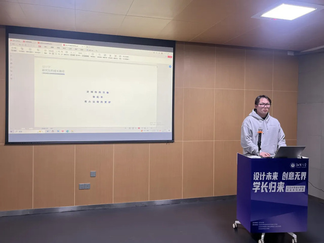 讲座伊始,刘艺东学长从自身 “设计小白” 时期的迷茫与探索讲起,结合本科及硕士初期的求学经历,直击设计类学生在学术研究中 “无从下手” 的痛点。他系统拆解了自己在长期实践中总结的科研方法,从选题方向、研究框架搭建到资料搜集与分析,为学子们提供了可落地的学术入门指引。