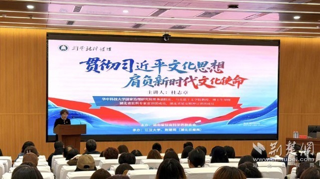 在全省上下深入学习贯彻党的二十届四中全会精神、科学谋划“十五五”发展蓝图的关键时期,11月6日,由湖北省社科联主办的“荆楚社科讲坛”走进江汉大学,湖北省社科专家宣讲团成员、华中科技大学国家治理研究院常务副院长、马克思主义学院教授、博士生导师杜志章以《贯彻习近平文化思想 肩负新时代文化使命》为题,深刻阐释了习近平文化思想的精髓要义。