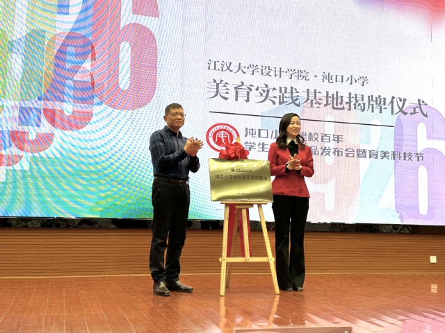 在沌口小学建校百年学生文创产品发布会暨美育科技节的活动现场,江汉大学设计学院与沌口小学共建的校外美育实践基地正式揭牌。本次校地美育合作项目由江汉大学设计学院视觉传达设计系教师支部书记魏坤教授牵头推进,魏坤教授带领支部教师代表出席活动,江汉大学设计学院院长万波亦亲临现场见证这一重要时刻。
