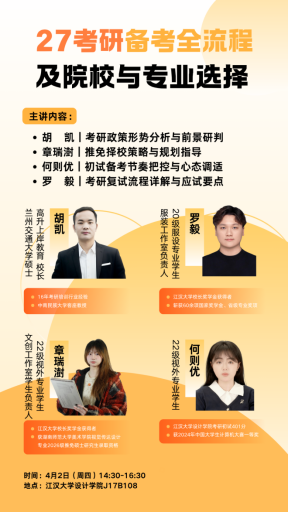 4月2日下午,江汉大学设计学院在J17B108教室举办2027届考研保研经验分享专题讲座。本次活动面向学院23级、24级本科学生开展,特邀高升上岸教育校长胡凯、学院2026届推免生章瑞澍、2026届考研上岸学子何则优与罗毅进行分享,旨在帮助低年级学子明晰升学路径,破解考研保研备考难点,精准把握升学规划核心方向。