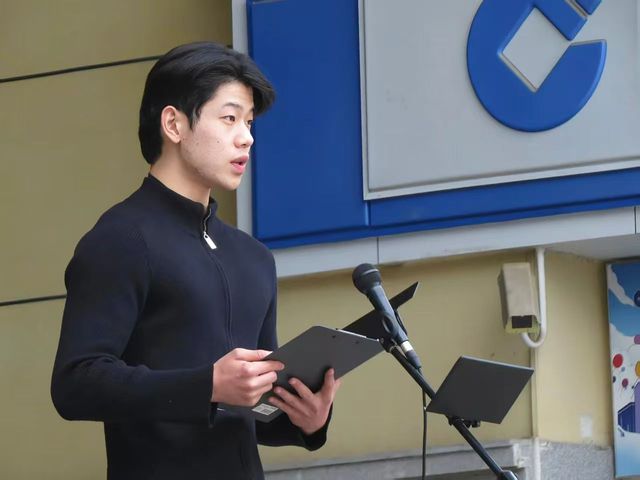 随后,设计学院表演241班退役大学生士兵周立纯登台发言。他身着简装,身姿挺拔如松,眼神坚毅如钢,以真挚朴实的语言、情真意切的表达,分享了自己从军报国的心路历程与成长感悟,字字句句都饱含着对祖国的赤诚与对青春的担当。