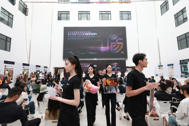 4月20日,江汉大学美育浸润系列活动暨设计学院2026届毕业成果展在师生服务中心一楼大厅开幕。江汉大学校长景新华、副校长李卫东、硚口区政协副主席郭军、赛武当国家级自然保护区管理局党组书记兼局长万正龙、湖北省文联文学艺术院副院长李平、汉正街道办事处副主任朱玲萍、武汉设计之都对外联络部部长李加宝、武汉市规划协会副秘书长郑玥、湖北省包装联合会设计委员会主任蒋群、学校相关职能部门负责人、业界嘉宾、合作企业代表及设计学院全体师生齐聚一堂,共襄设计盛会,共品匠心佳作,共话青年担当。