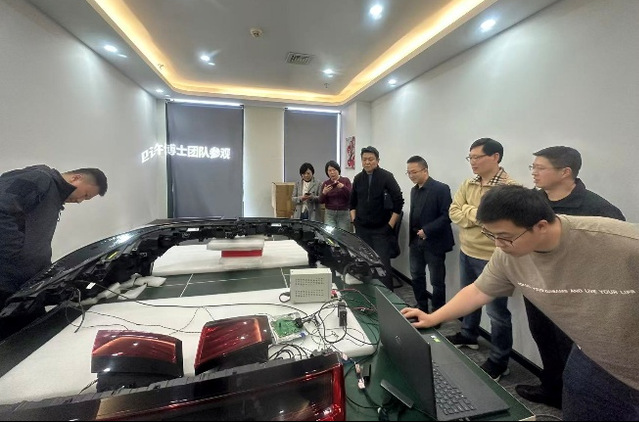 在胡经理与技术人员陪同下,教师团队实地参观了产品展示区,近距离体验了公司最新研发的高像素智能车灯、投影交互车灯、动态氛围尾灯等系列创新产品,深入了解车灯在智能驾驶、路面投影、人车交互等场景的技术应用与设计亮点。产品对标高端车型,集成36像素光学模块、路面导航提示、动态光效交互等功能,让老师们直观感受到汽车灯光从“照明功能”向“智能交互载体”的转型趋势。