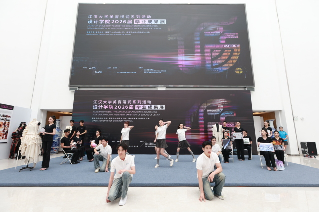 4月20日,江汉大学美育浸润系列活动暨设计学院2026届毕业成果展在师生服务中心一楼大厅开幕。江汉大学校长景新华、副校长李卫东、硚口区政协副主席郭军、赛武当国家级自然保护区管理局党组书记兼局长万正龙、湖北省文联文学艺术院副院长李平、汉正街道办事处副主任朱玲萍、武汉设计之都对外联络部部长李加宝、武汉市规划协会副秘书长郑玥、湖北省包装联合会设计委员会主任蒋群、学校相关职能部门负责人、业界嘉宾、合作企业代表及设计学院全体师生齐聚一堂,共襄设计盛会,共品匠心佳作,共话青年担当。